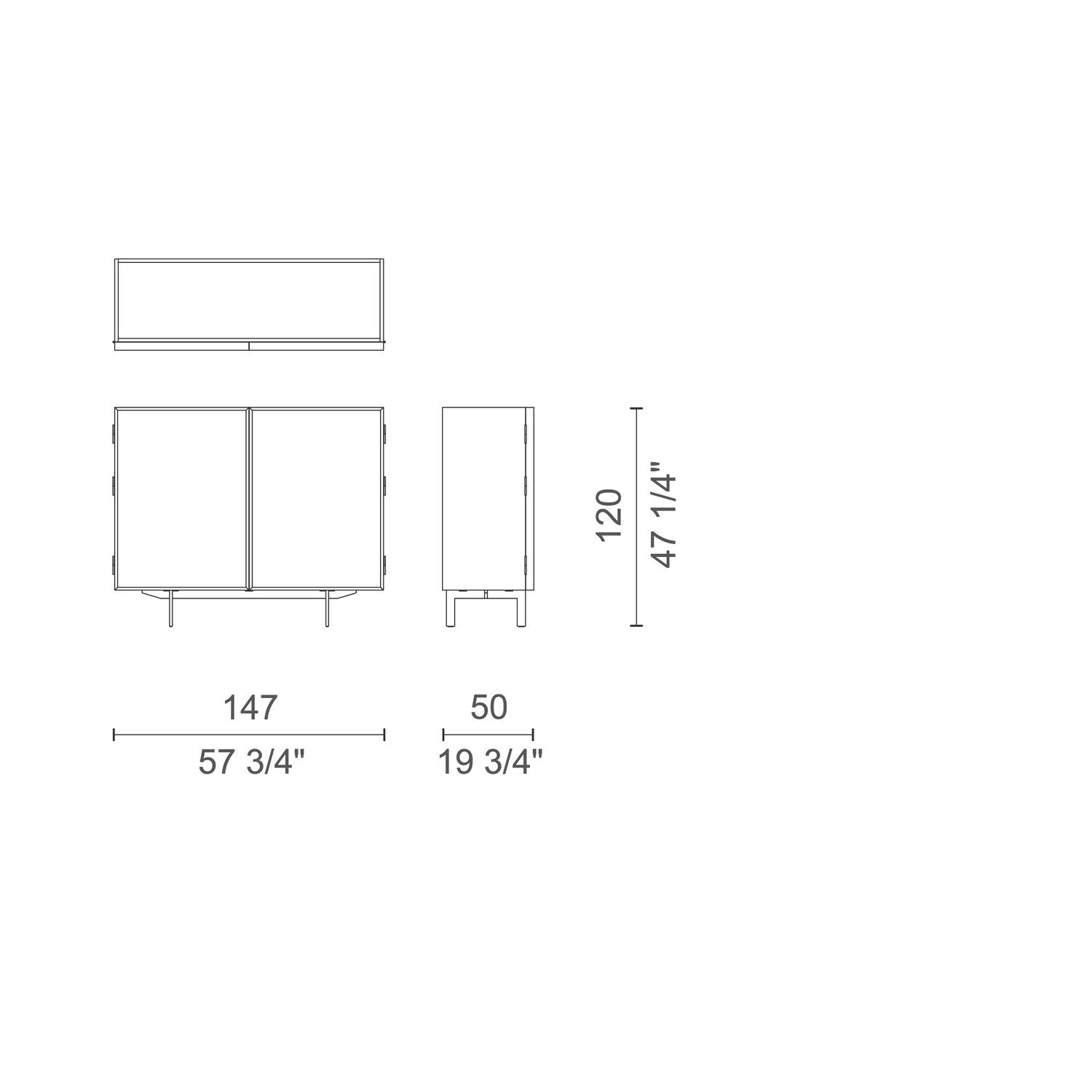 Sideboard z drzwiami skrzydłowymi: ok. 147 × 50 × 120 cm (na podstawie 57.75″ × 19.75″ × 47.25″). Idealny jako wysoka komoda do jadalni lub domowego biura.