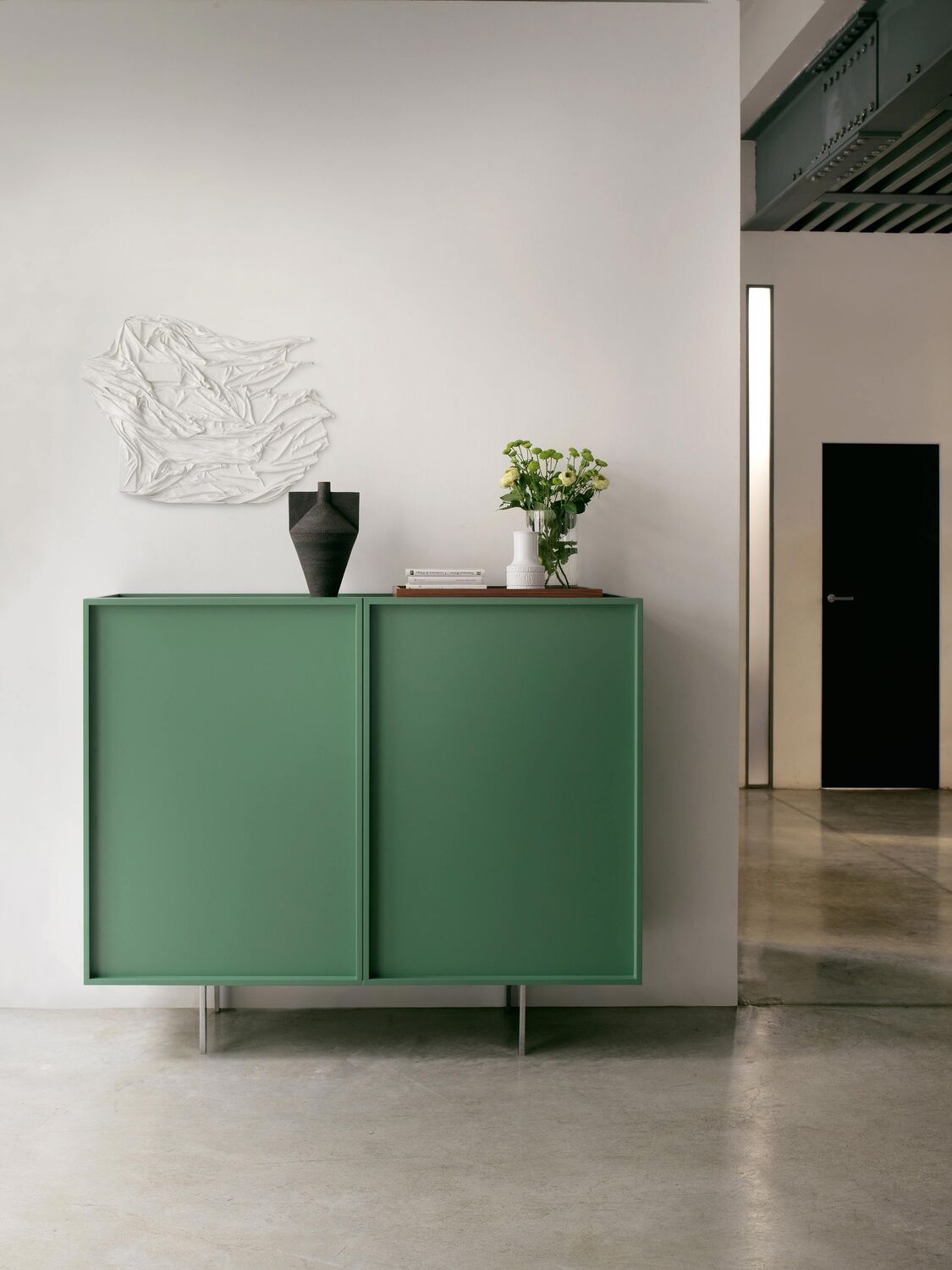 Harmonijnie ukryte podziały frontów, płynna linia i minimalistyczne uchwyty sprawiają, że komoda Lochness Cappellini ma nowoczesny charakter, ale nie dominuje we wnętrzu.