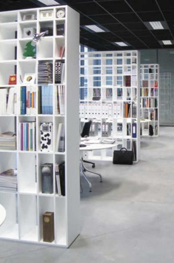 • Przestrzeń publiczna: w showroomach i hotelach Bookshelf podkreśla charakter wnętrza, nie dominując go.